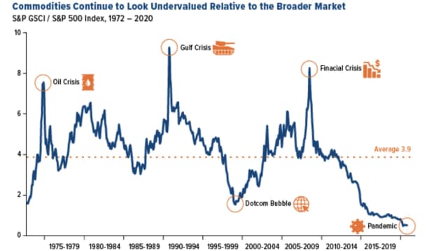 To gird against such weakness, Rogers pointed out that commodities, as you can see from this chart highlighted in the blog post, are offering an historic bargain relative to equity valuations: